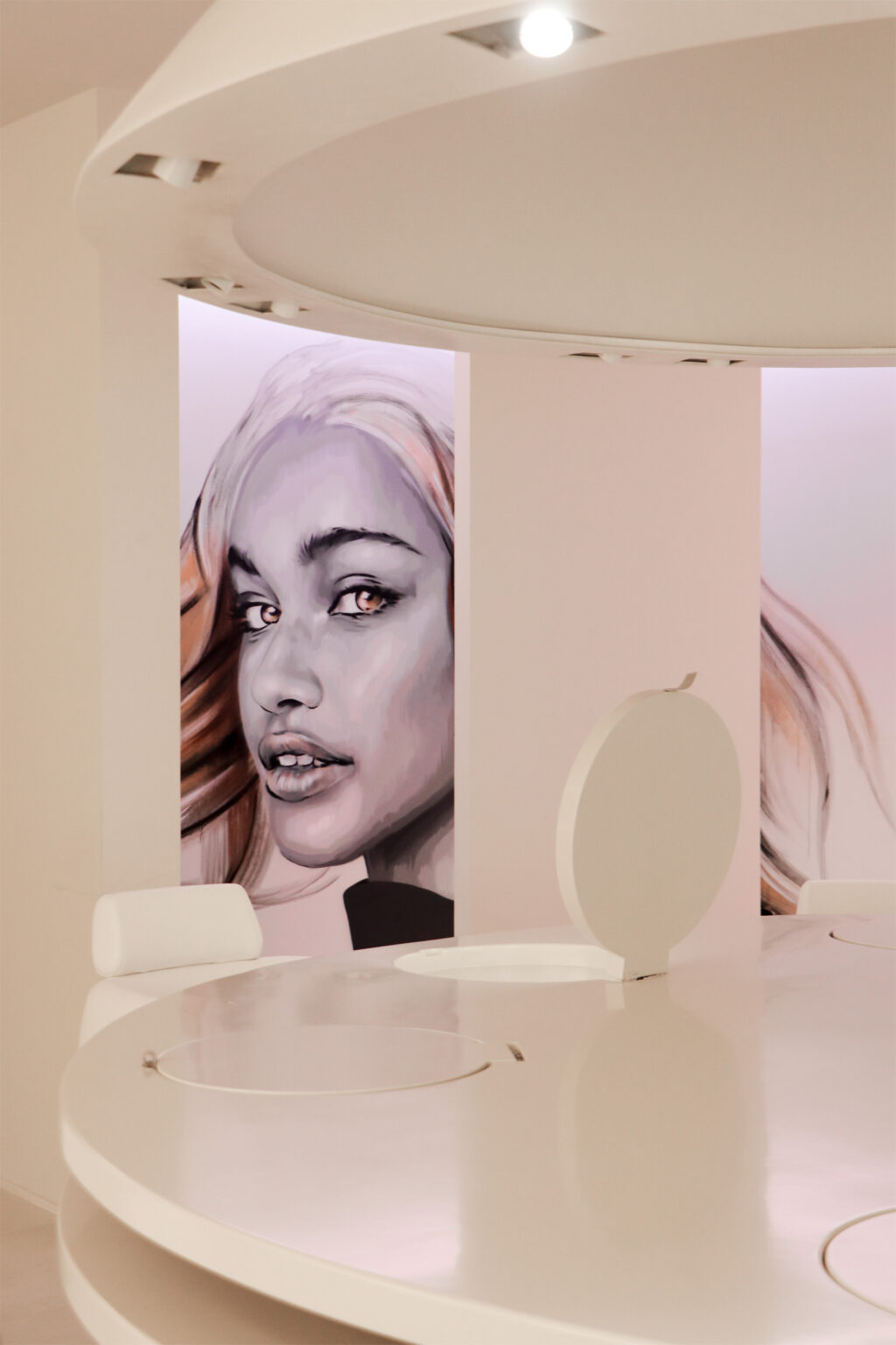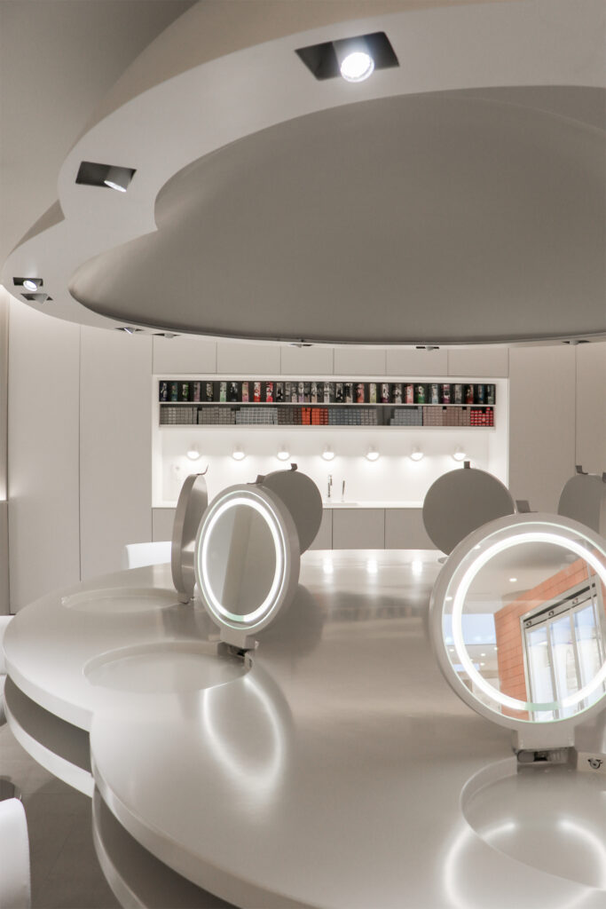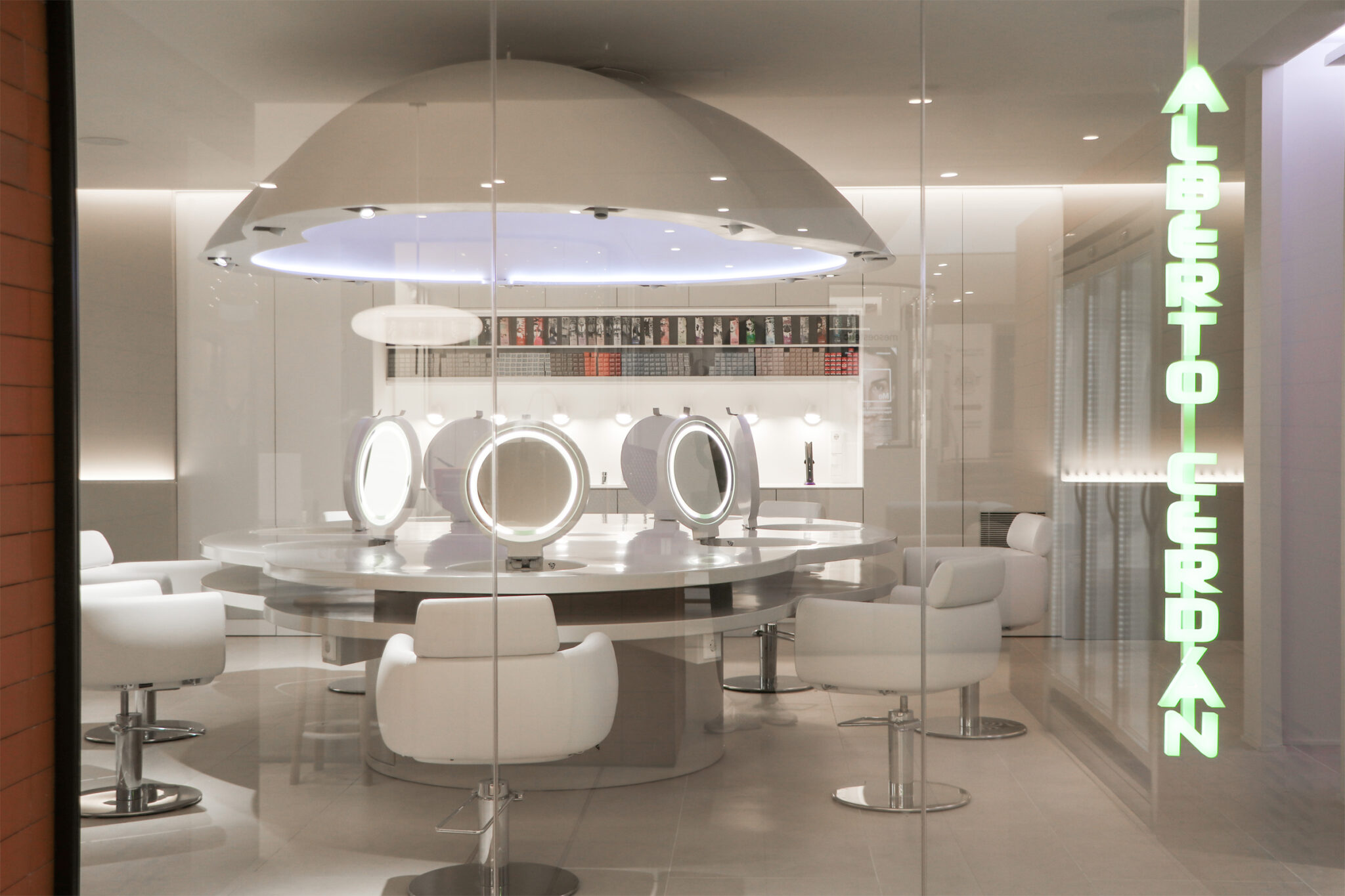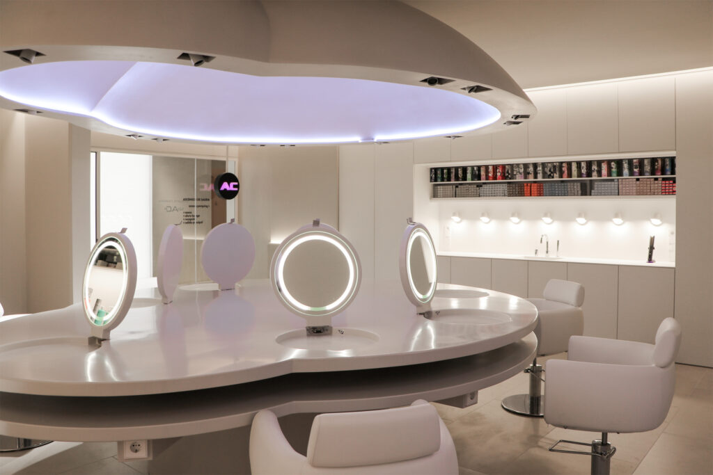 Alberto Cerdán opened a space in one of the uptrend beauty areas in the city, featuring a sizeable 3-meter table and resin-made lamp of the same size in the center of the saloon. The idea allowed groups of friends to enjoy a beauty routine while facing each other, making interacting easier.